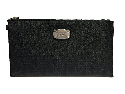 Wrapped in mocha brown MK signature logo patterned PVC with golden tone hardware. This large zip top clutch is lined and features 6 credit card slots and an open slip pocket. It is trimmed in natural tone leather. The front is accented with MK nameplate logo and it has a wristlet strap. It measures approximately 10′ (L) x 5.5′ (H).